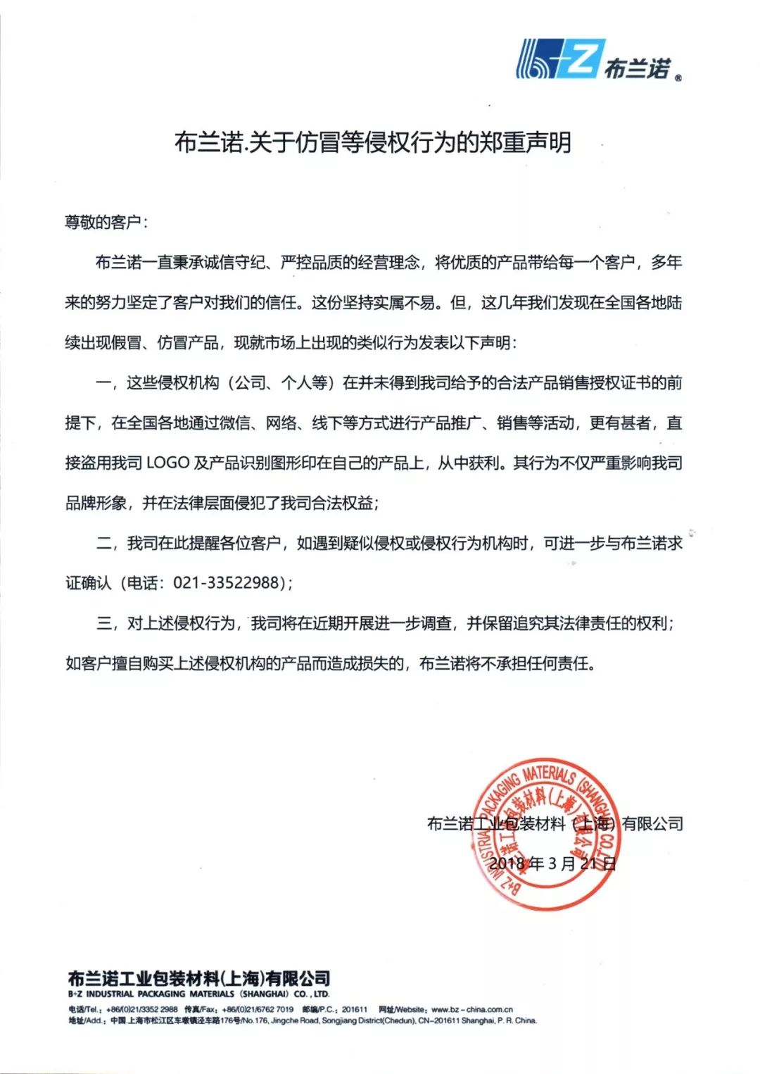 現我司已發(fā)現若干假冒、仿冒“布蘭諾工業(yè)包裝材料”的產(chǎn)品,該類(lèi)產(chǎn)品與我司生產(chǎn)的產(chǎn)品極為相似,容易使相關(guān)公眾產(chǎn)生誤認,在此提醒廣大消費者注意加以甄別。目前,使用該假冒、仿冒商品的消費者已向我司提供了侵權的相關(guān)證據。對存在以上侵權行為的公司和個(gè)人,現我司鄭重聲明如下:此類(lèi)侵權公司及個(gè)人從即日起,停止銷(xiāo)售假冒、仿冒“布蘭諾工業(yè)包裝材料”品牌商品,對已銷(xiāo)售的商品進(jìn)行召回,對已生產(chǎn)的假冒、仿冒產(chǎn)品進(jìn)行銷(xiāo)毀。